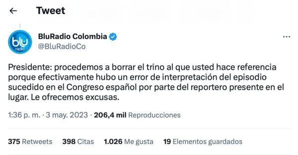 Blu Radio es la emisora dirigida por el periodista Nestor Morales, cuñado del expresidente Iván Duque, y quien desde hace varios años decidió convertirse en un activista político más contra Petro aprovechando sus micrófonos para desinformar y mentirle a los colombianos como en este caso, el más reciente. Fue tan evidente el dolo en la publicación que tuvo que rectificar la semana pasada y ofrecerle »excusas» al mandatario, pero le daño a la imagen del presidente nunca se borra y la mentira queda grabada en miles de internautas. Qué hubiera pasado si Petro desde su cuenta de Twitter no hubiera expuesto su molesta con esa publicación?
